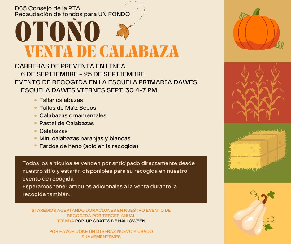 El Fondo Uno PTA Evanston/Skokie está celebrando el otoño con una venta de calabazas y decoraciones de otoño. Haga su pedido de calabazas, y tallos de maíz ahora y puede recogerlas el viernes, septiembre 30, 4-7 pm en escuela elementaria Dawes. Pedidos avanzando hasta Septiembre 25.