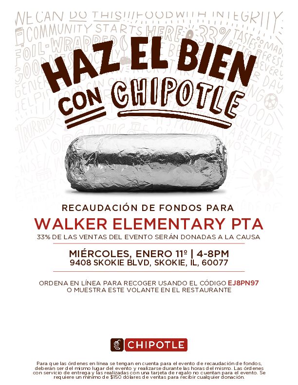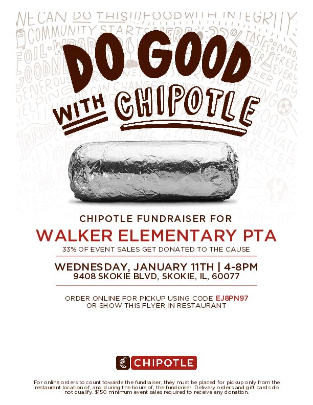 Calling all burrito lovers, Foil your dinner plans and stop by the Chipotle at 9408 Skokie Blvd in Skokie for our fundraiser on Wednesday, January 11 from 4:00pm – 8:00pm. We’re raising money to support Walker Elementary PTA, so just download a flyer from the link below or mention the fundraiser at checkout and they’ll donate 33% of the proceeds to the cause! Click here for more details. Can’t wait to see you!
