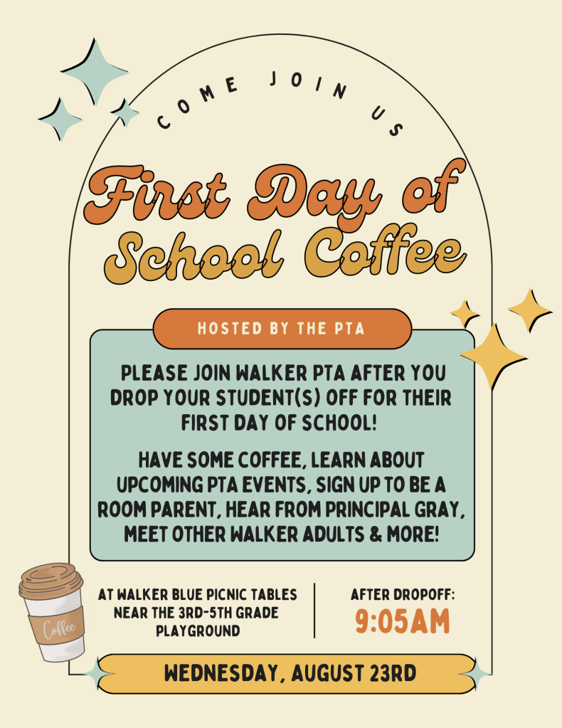 Welcome! First Day of School Coffee: August 23rd at 9:05am