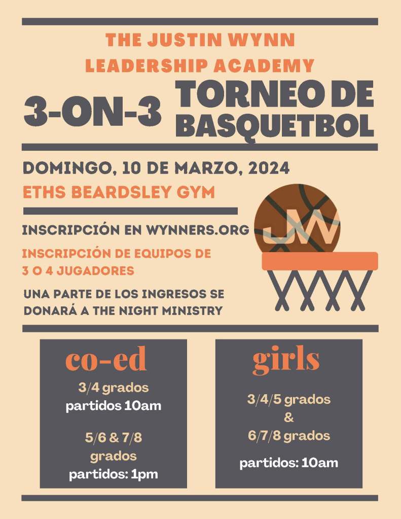 On March 10, 2024, at the Beardsley Gym, ETHS, play in the 18th Annual Justin Wynn Leadership Academy 3-on-3 Basketball Tournament! There are both co-ed and girls’ tournaments for kids in 3rd-8th grades.