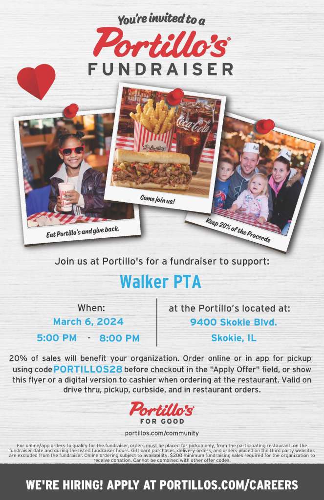 March Walker Restaurant Night: Portillo’s on March 6th, 5-8pm