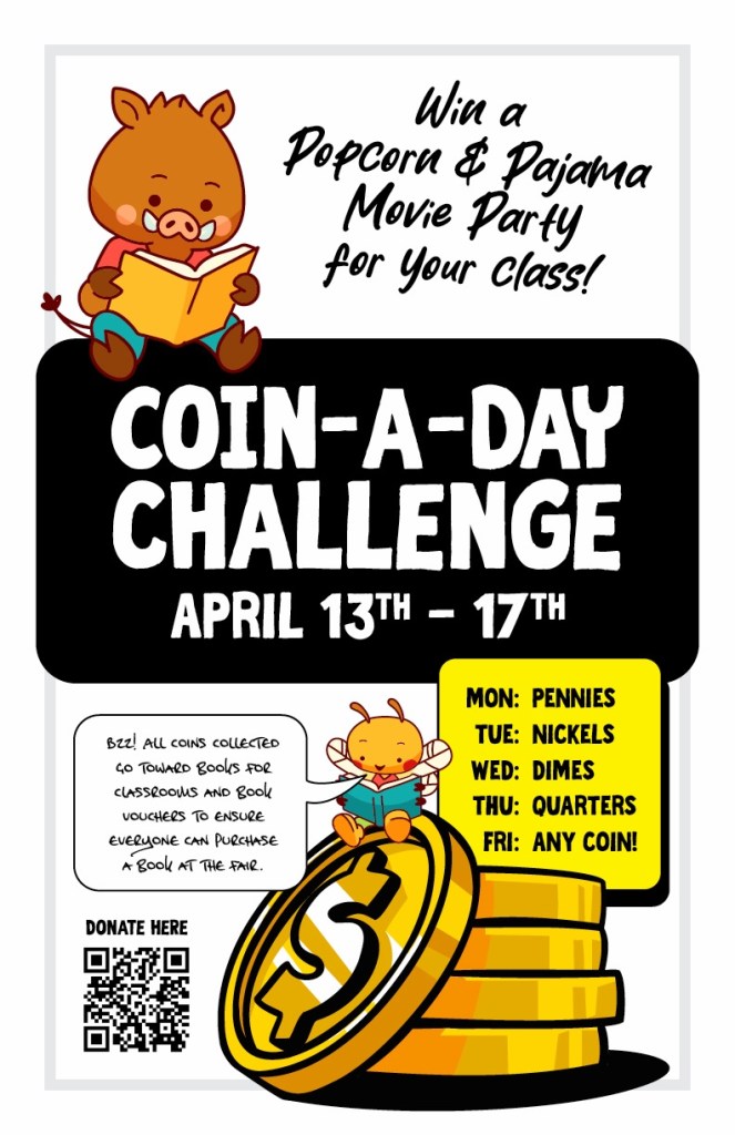 • Coin Drive April 13, 2026 – April 17, 2026 MON: PENNIES TUE: NICKELS WED: DIMES THU: QUARTERS FRI: ANY COIN!