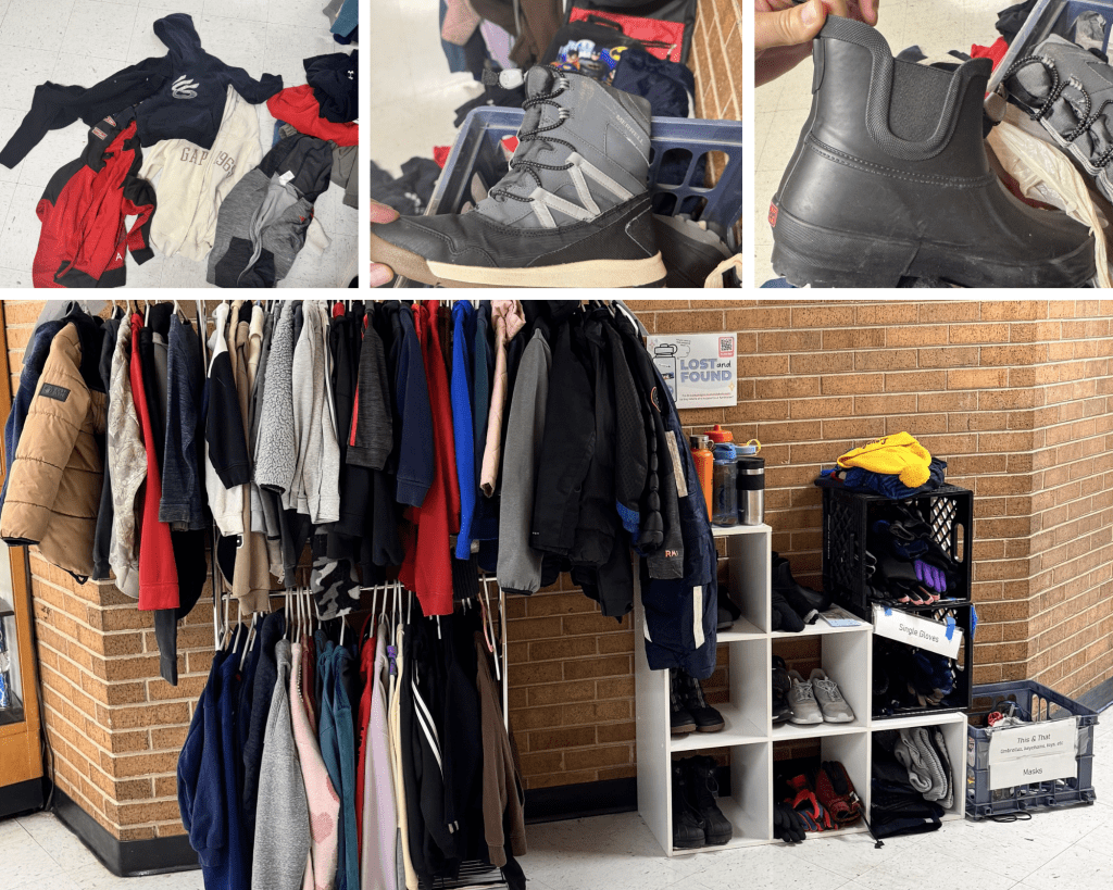 Lost & Found is outside the auditorium doors by the trophy case. Right now you’ll find sweatshirts, coats, water bottles, shoes, winter hats and gloves—and a few miscellaneous items. We’ll post updated photos and item callouts every Friday, so be sure to check back.