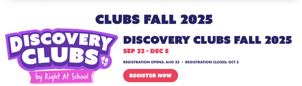 Fall Discovery Clubs – Register Now! Closes 10/3. Link: https://www.rightatschool.com/registration/?school=walker-elementary